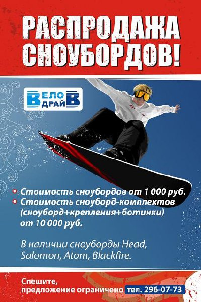 В магазине "Велодрайв-Озерки" распродажа сноубордов. В наличии сноуборды Head, Salomon, Atom, Blackfire. Стоимость сноубордов (уцененных) от 1000 руб до 7000 руб.Стоимость сноуборд-компектов (сноуборд+крепления+ботинки) от 10 000 до 12 000 руб.Спешите, предложение ограничено. Тел. 296-07-73.